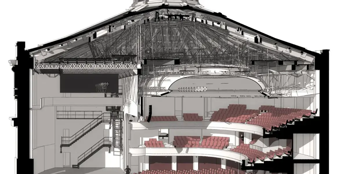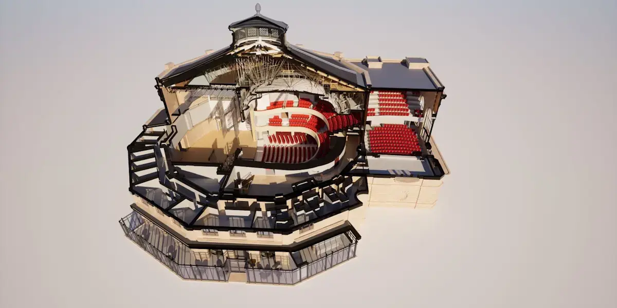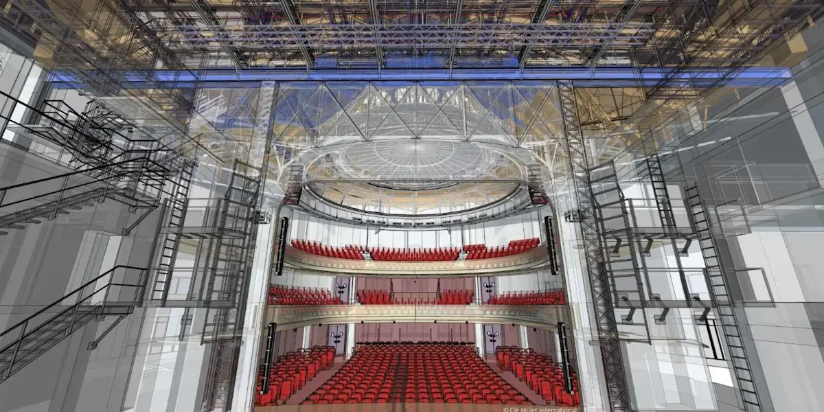 ภาพจาก SketchUp แสดงมุมมองภายในของโรงละคร Marigny เลื่อนลงเพื่อดูภาพตัดขวางของโรงละคร Marigny ที่แสดงให้เห็นหลังคาที่เอียง ภาพประกอบโดย Clé Millet