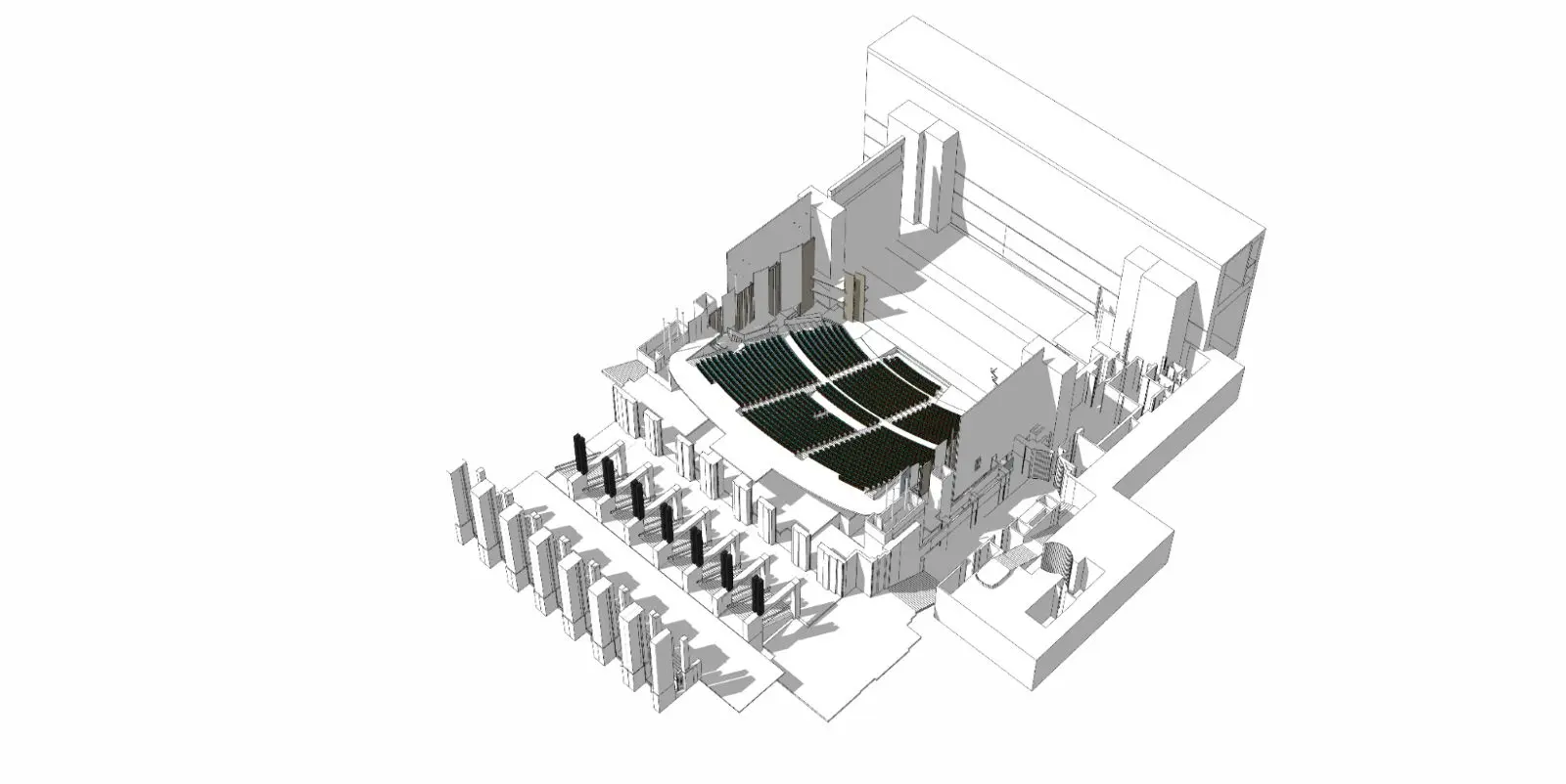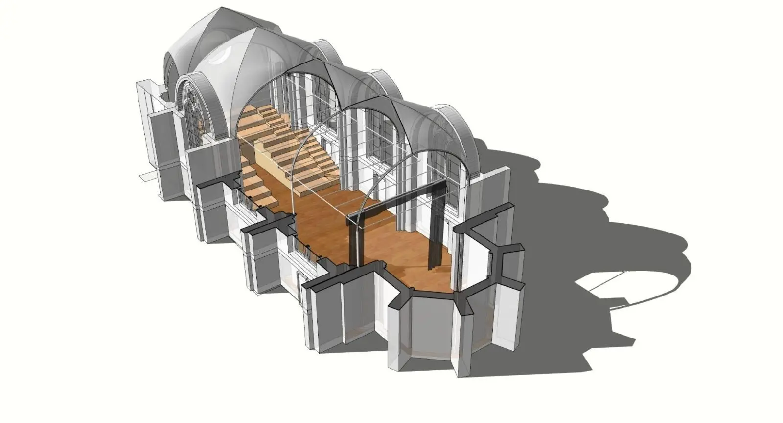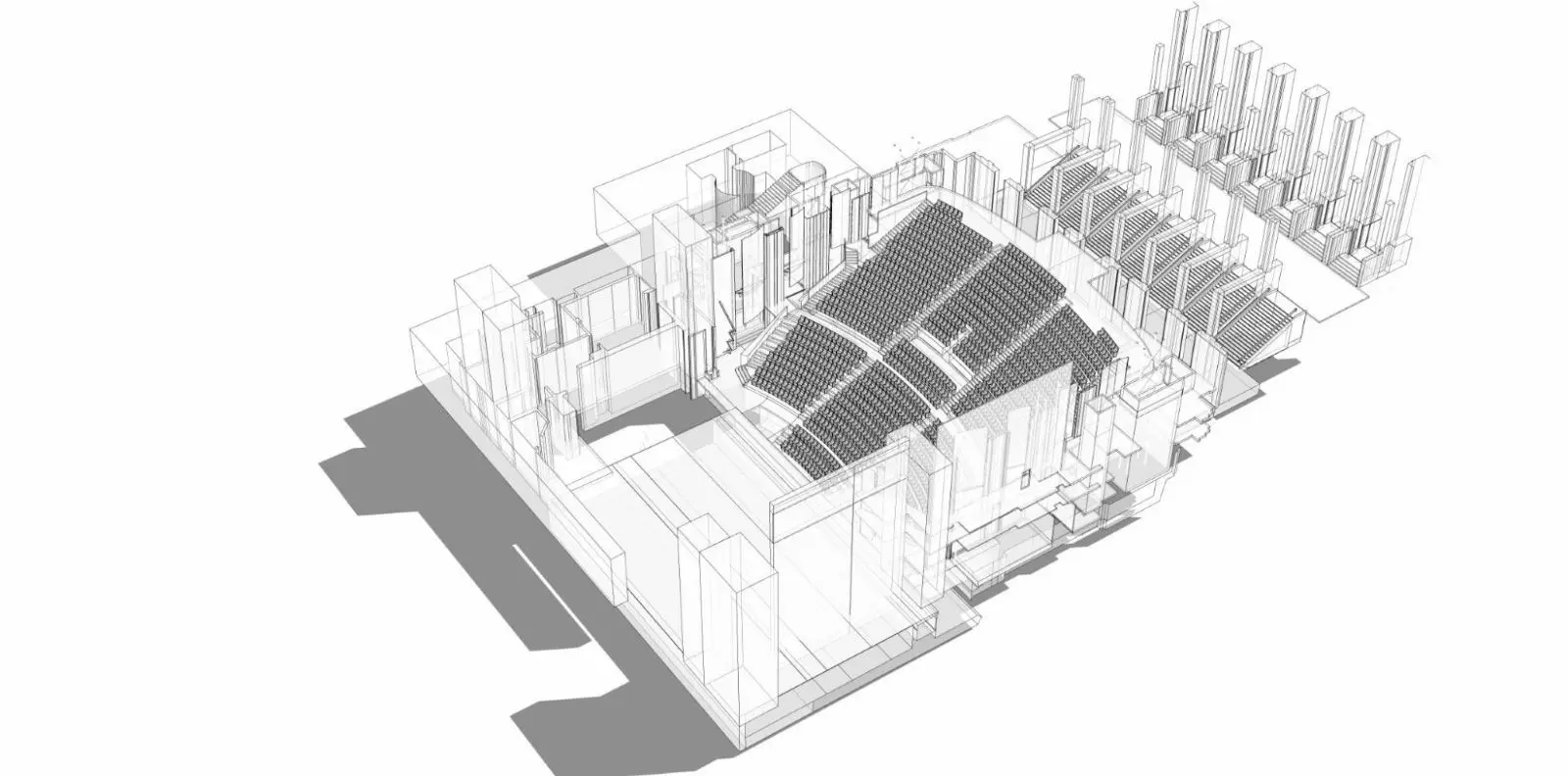 ภาพจาก SketchUp แสดงเงาของพื้นที่การแสดงของโรงละครนาฏศิลป์แห่งชาติชาโยต์ ภาพโดย Clé Millet
