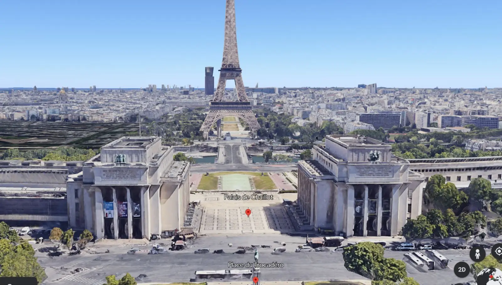 ภาพจาก Google Street View แสดงที่ตั้งของโรงละครนาฏศิลป์แห่งชาติชาโยต์ (Chaillot National Dance Theater) เมื่อเทียบกับหอไอเฟล ภาพโดย Clé Millet