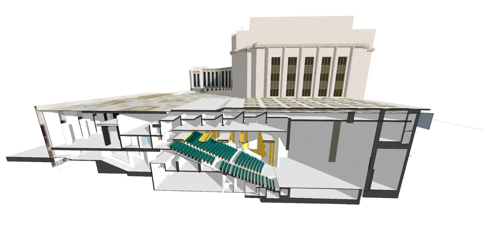 ภาพจาก SketchUp แสดงโรงละครใต้ดินของโรงละครนาฏศิลป์แห่งชาติชาโยต์ พร้อมกับแบบจำลองจาก 3D Warehouse ที่แสดงบริบทเพิ่มเติมเหนือพื้นดิน ภาพโดย Clé Millet