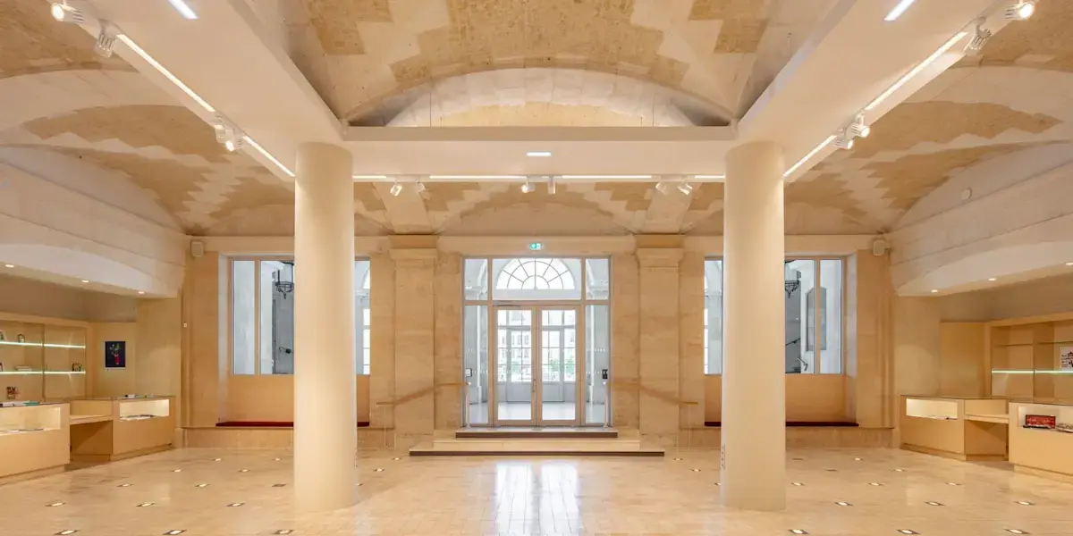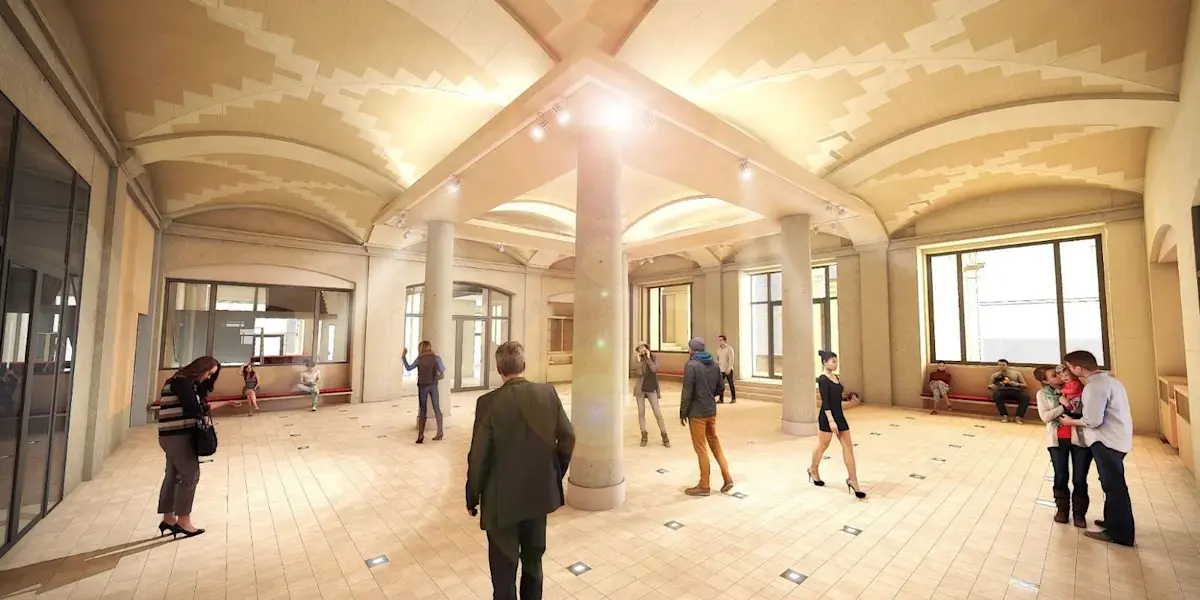 ภาพจำลองล็อบบี้ของโรงละครแซงต์โอเมอร์ ภาพถ่ายล็อบบี้โรงละครแซงต์โอเมอร์ก่อนและหลังการปรับปรุง เครดิตภาพ: มาร์ติน อาร์กีโรโกล ภาพจาก Clé Millet